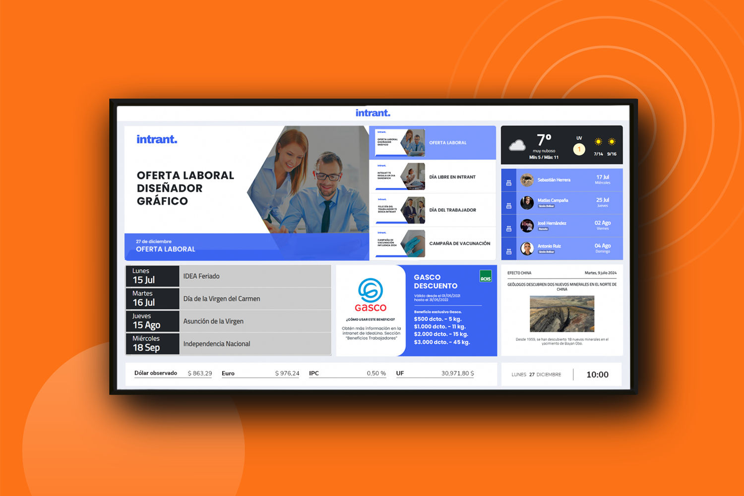 Utiliza una o más TV en espacios comunes para mostrar el contenido de tu intranet.